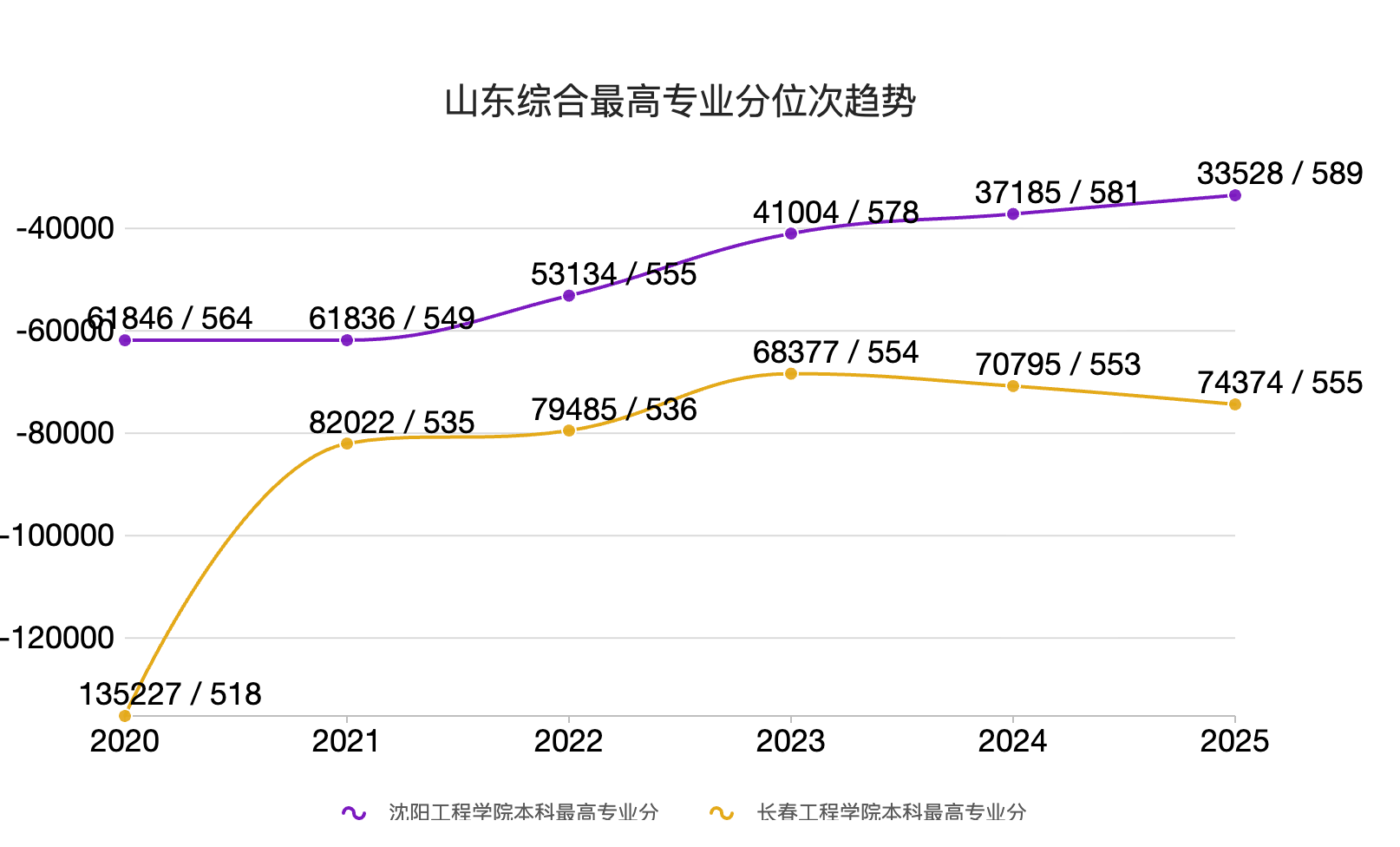 比如在山东,如下图所示,我们比较专业最高分(因为电气专业一般是最高分),沈阳工程学院的分数比长春工程学院要高44分。