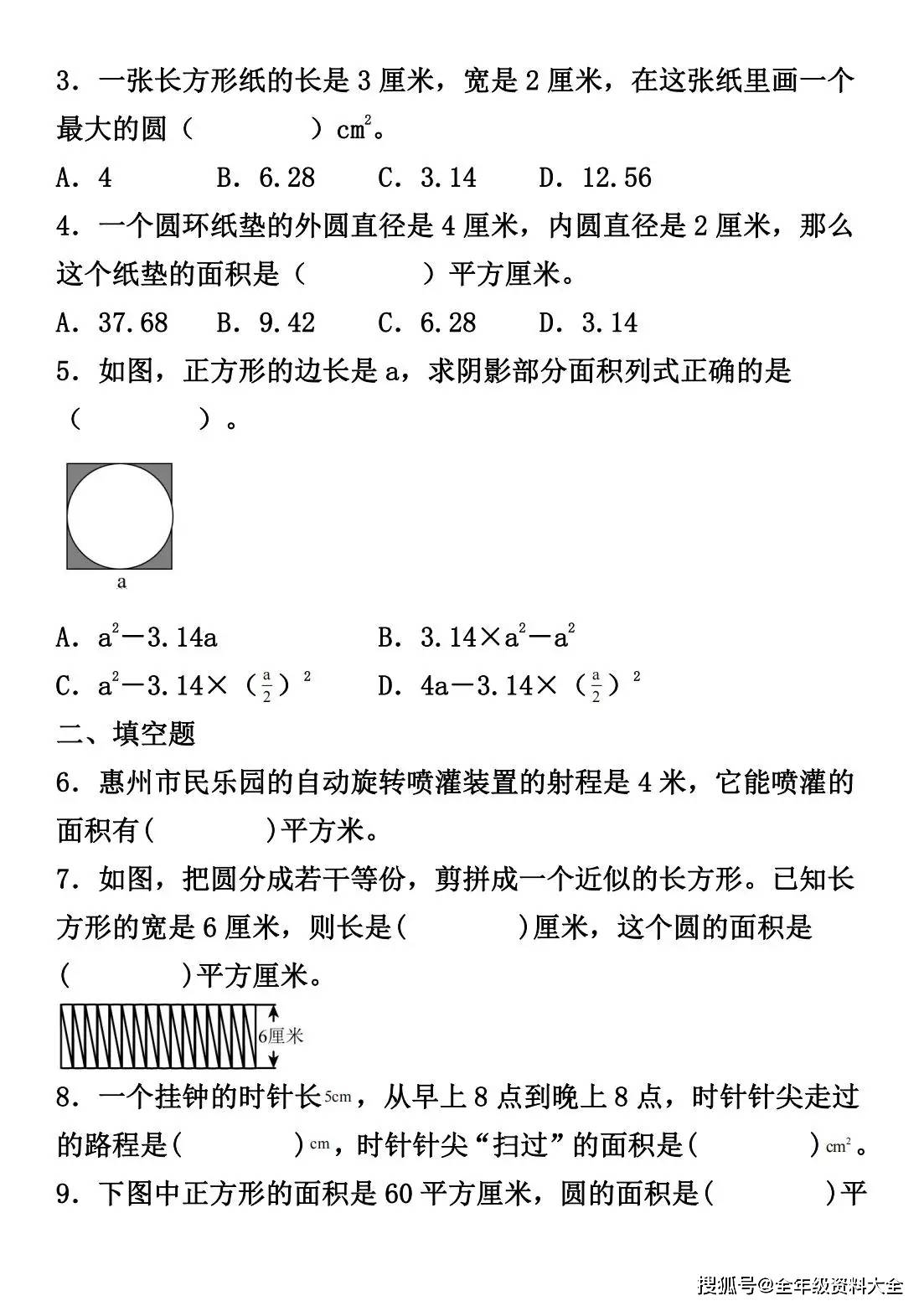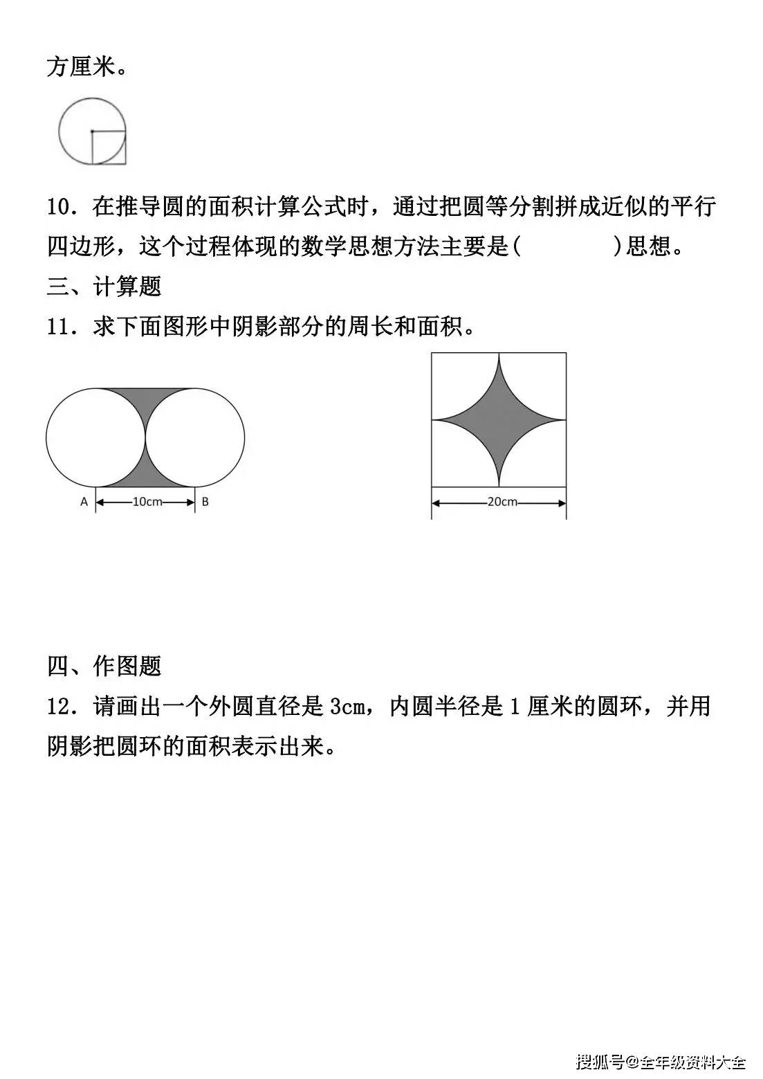 - 操作实践类题型:设计作图题,如 “画一个半径为 2 厘米的圆,标出圆心、半径,并计算它的面积”,让学生在动手操作中熟悉圆的画法,同时巩固 “作图 - 计算” 的连贯流程;还有 “在方格纸上将圆分割后拼成近似平行四边形” 等操作题,强化对转化思想的直观认知。