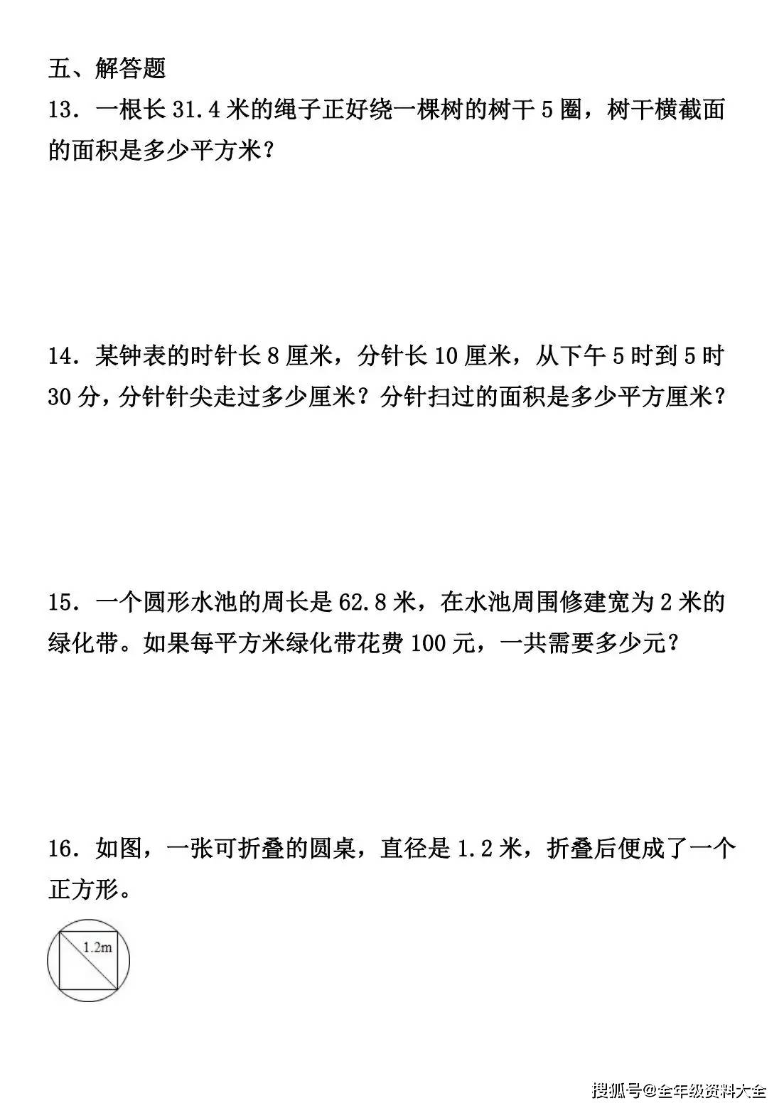 - 梳理知识体系:通过推导类题目与基础计算题目,帮助学生理清 “圆的面积公式推导过程 - 公式结构 - 不同已知条件下的应用方法” 的知识脉络,形成系统的知识框架,避免对公式的孤立记忆。