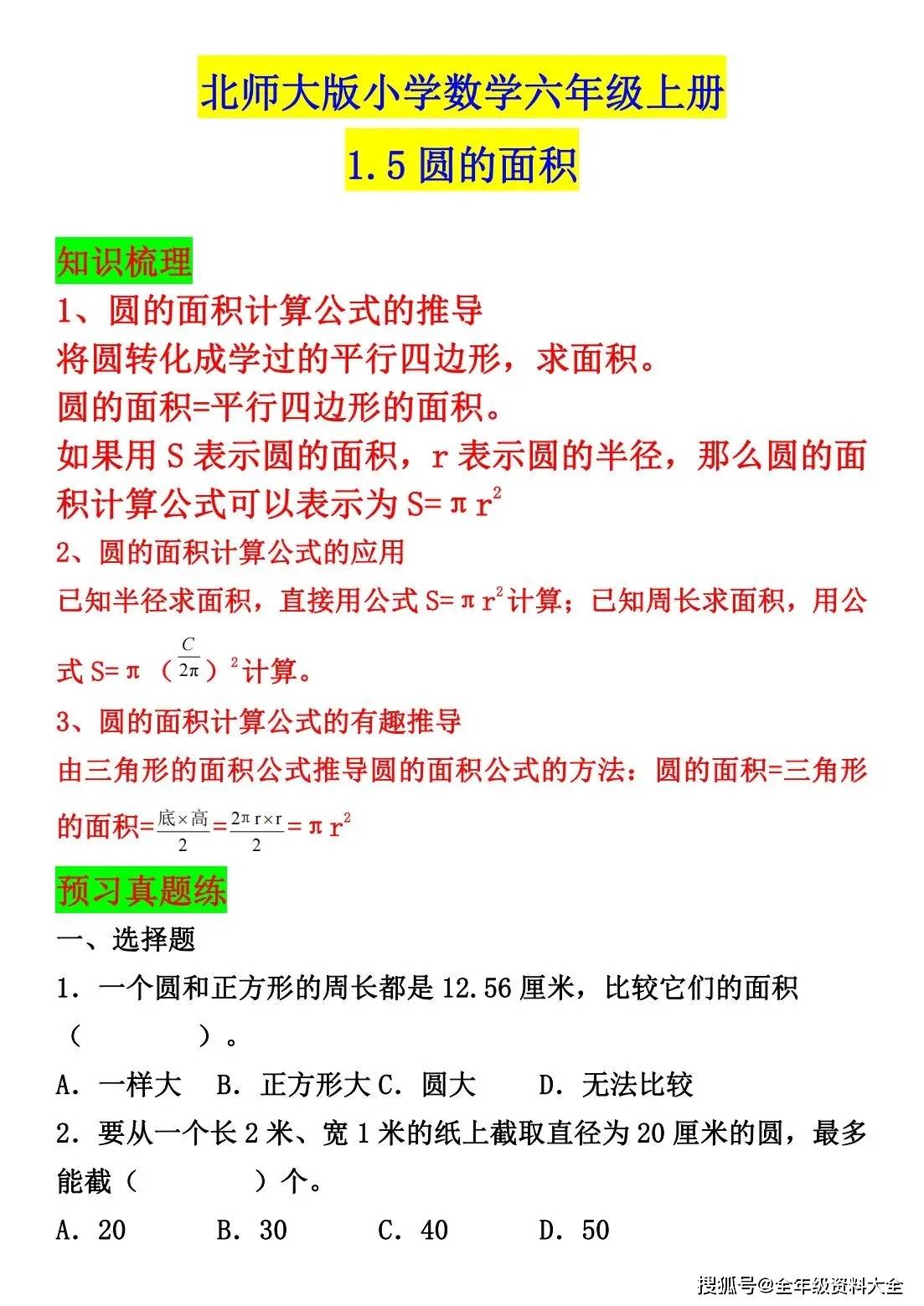 总之,这套北师大版六年级上册《圆的面积》练习题以 “理解本质、强化应用” 为核心,既能帮助学生扎实掌握圆的面积相关知识,又能通过多元情境与丰富题型提升综合能力,是学生学习圆的面积、夯实数学功底的优质练习资料。