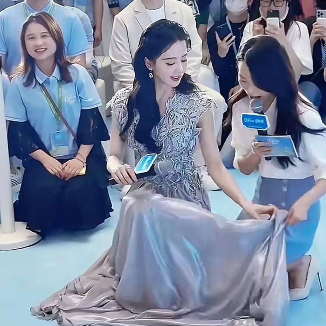 便赶紧用自己的裙摆,去帮主持人挡住腿部。