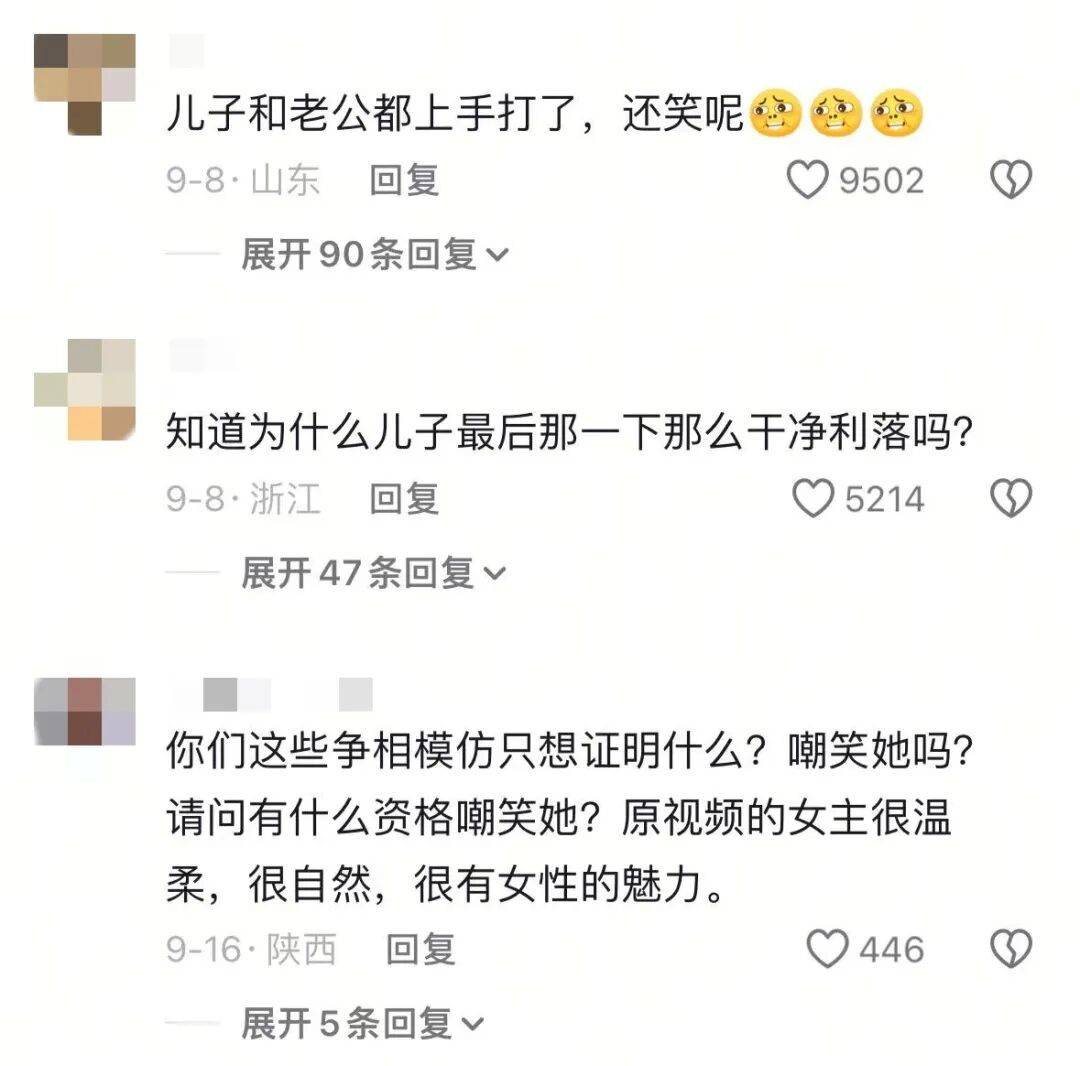 “你们这些争相模仿只想证明什么?请问有什么资格嘲笑她?原视频的女主很温柔,很自然。”
