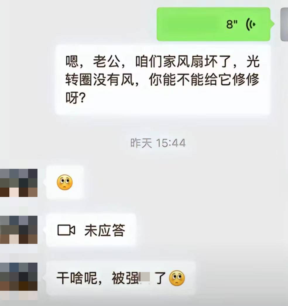 “我学着给我老公说了几句,他早晨没空,中午请假回来扇的我。”