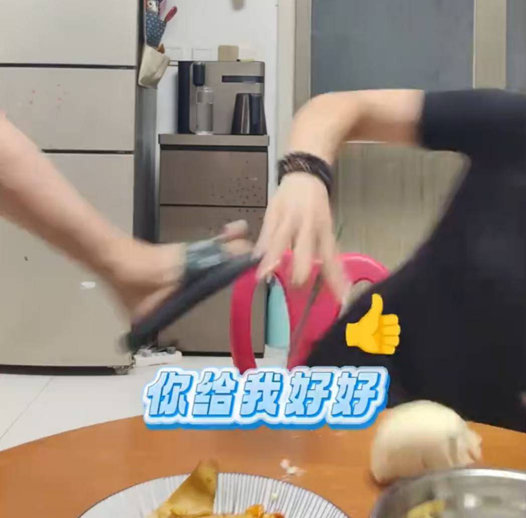 老婆满脸委屈地从地上爬起来,背景音乐却配上那种综艺假笑的音效。