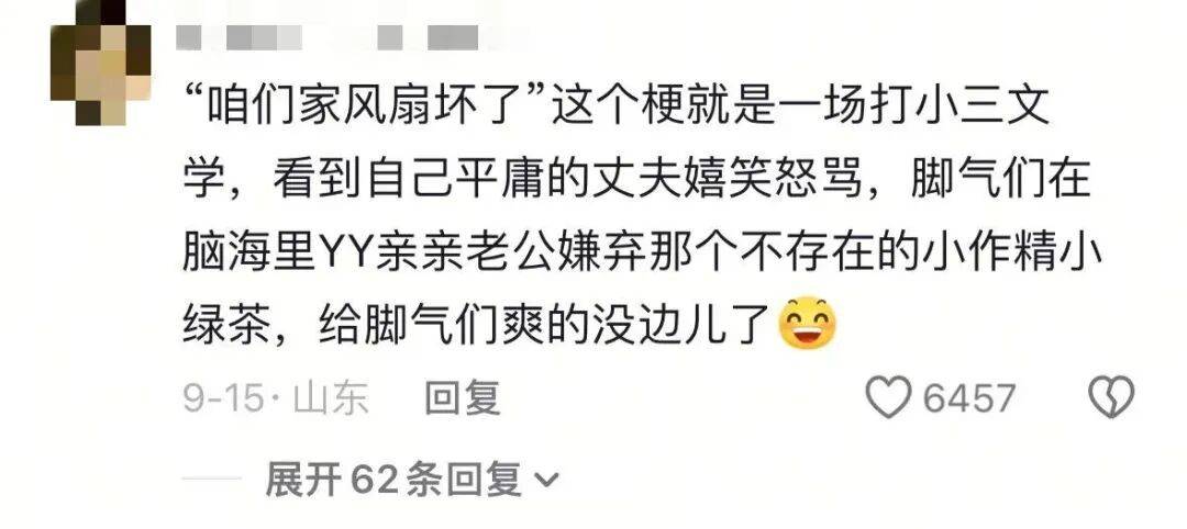 “这个梗就是一场打小三文学,看到自己平庸的丈夫嬉笑怒骂,娇妻们在脑海里YY亲亲老公嫌弃那个不存在的小作精小绿茶,爽得没边了。”