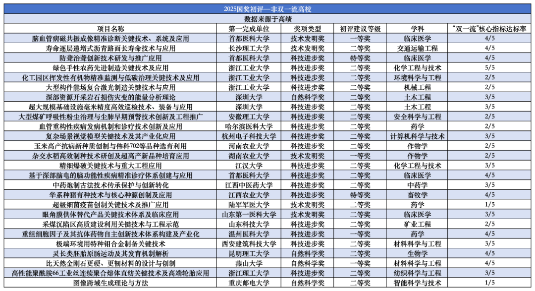 而就在近日,作为此前双一流评选重要指标之一的国家科学技术奖—2025年度初评结果发布,结合各大双非高校现有实力,时哥观察到其中有7所双非高校已经手握“王牌”,有极大的可能入选。