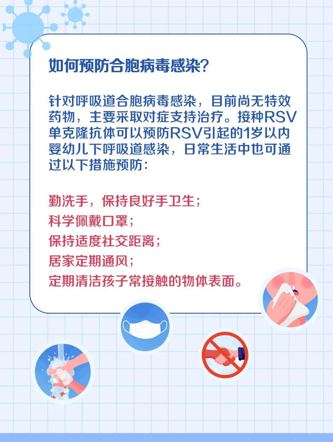在合胞病毒流行季节,尽量避免去人群聚集场所;外出时规范佩戴口罩,打喷嚏时注意遮挡;注意手卫生,不乱摸,勤洗手;在医疗机构就诊要做好个人防护,防止院内交叉感染。