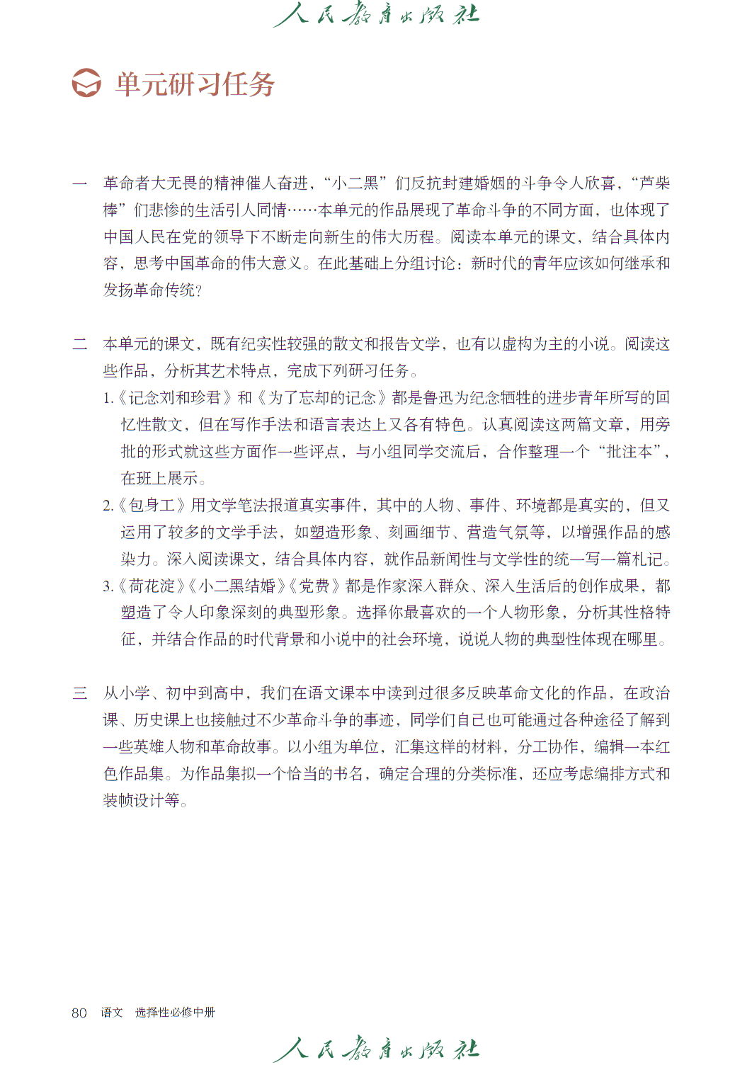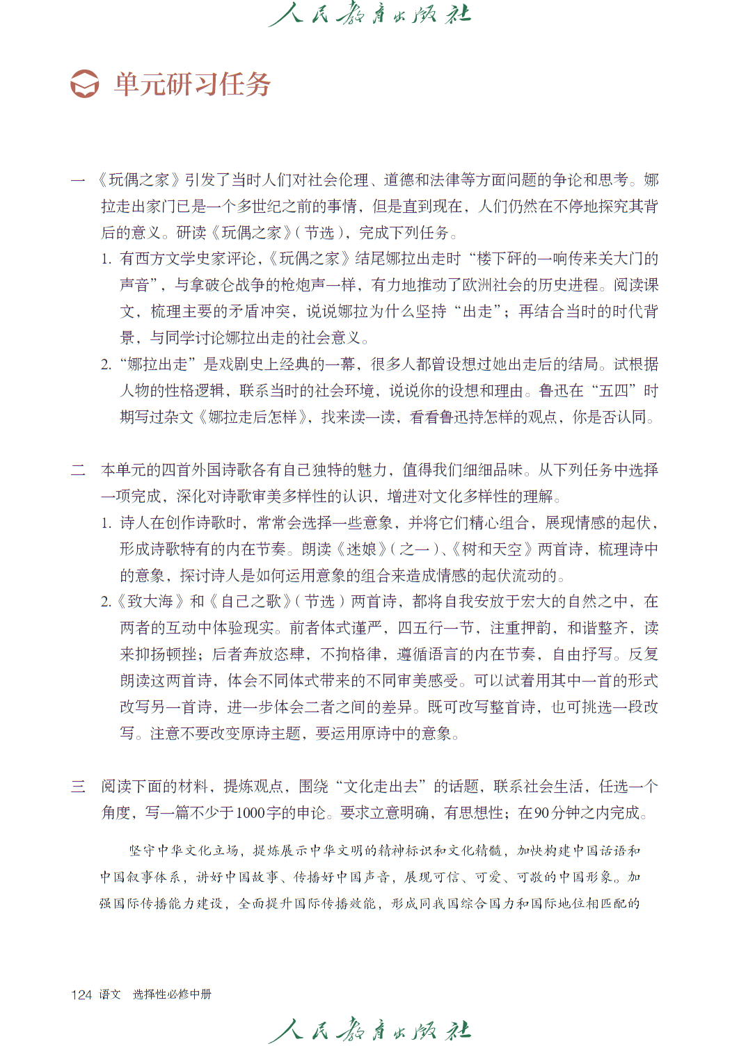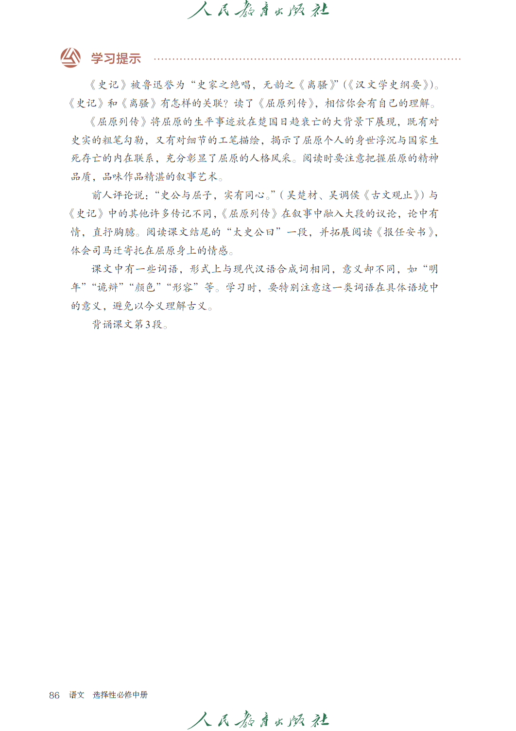 高中语文选修中册人教版电子课本,秉持 “人文主题” 与 “学习任务群” 双线编排理念,聚焦思想传承与思辨能力培育,共设四个单元及 “单元研习任务” 模块,呼应语文核心素养发展要求。