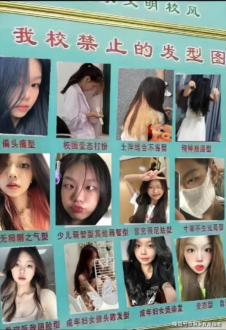不过最过分的还在后面,有一所学校的女生开始莫名其妙地流行“垂帘听政”发型,而这个发型的流行起源就更猎奇了,是一所学校总结出的“中学生不良发型”,这些被贴在公告板上的发型,成功吸引了学生的注意。