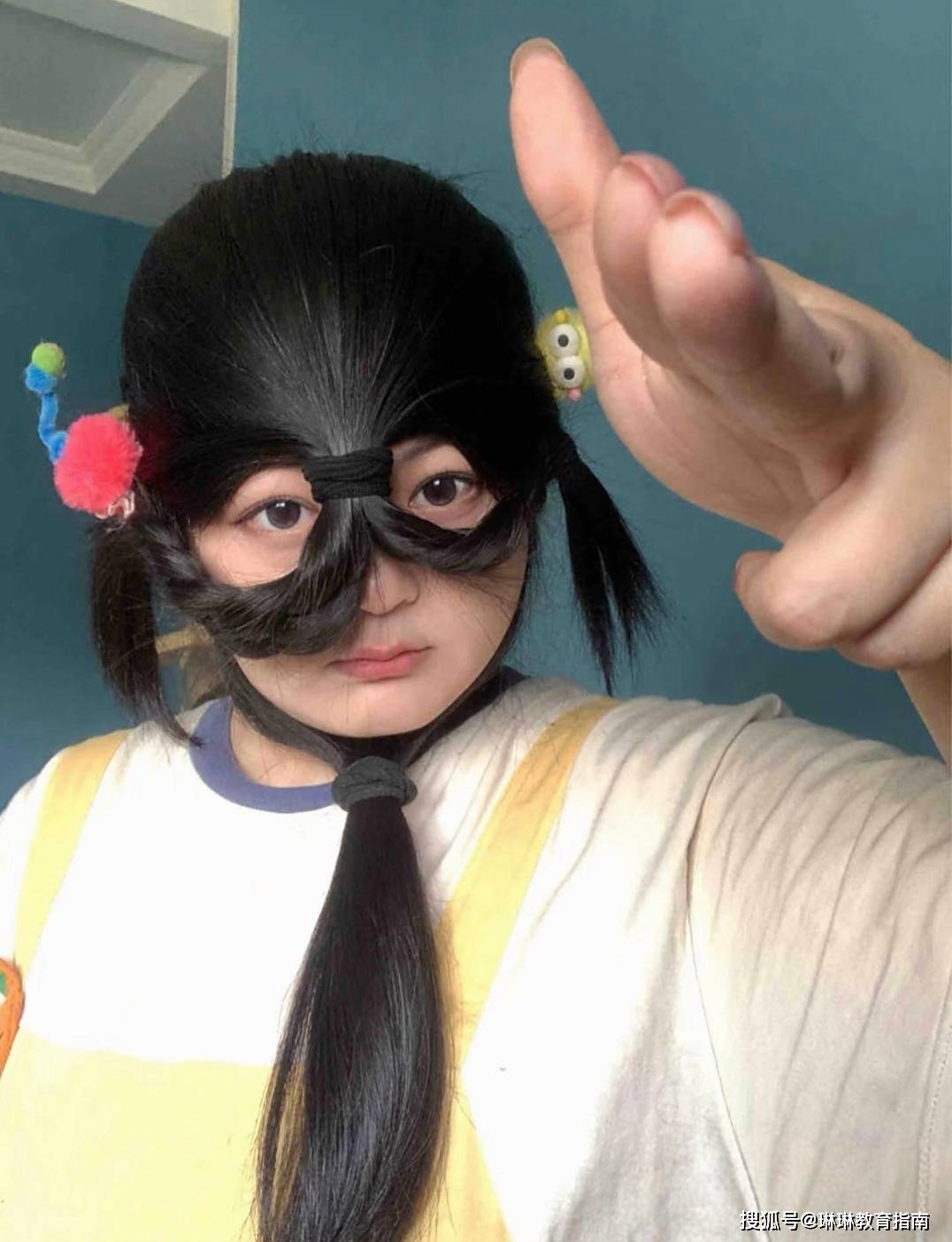 更有甚者开始cos这个发型,把长头发放在面前,通过编辫子和发夹的辅助,手动打造出了“垂帘听政”的发型,造型是既猎奇又形象,家长看后直言:难以接受,也无法欣赏。