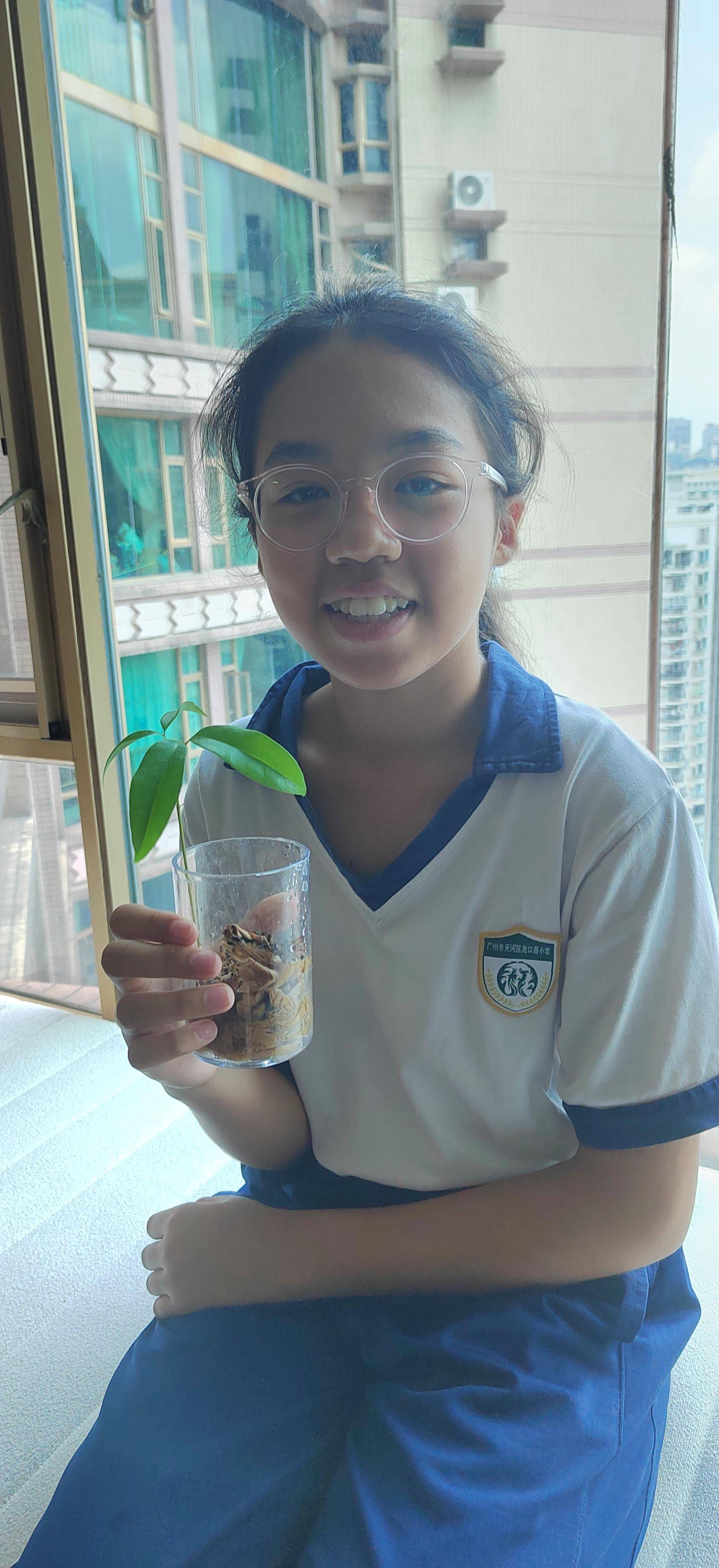 “我的芒果从一个小果核到慢慢发芽长枝,虽然小小只有点‘发育不良’,但我还是很爱它。”三年级的陈同学说。