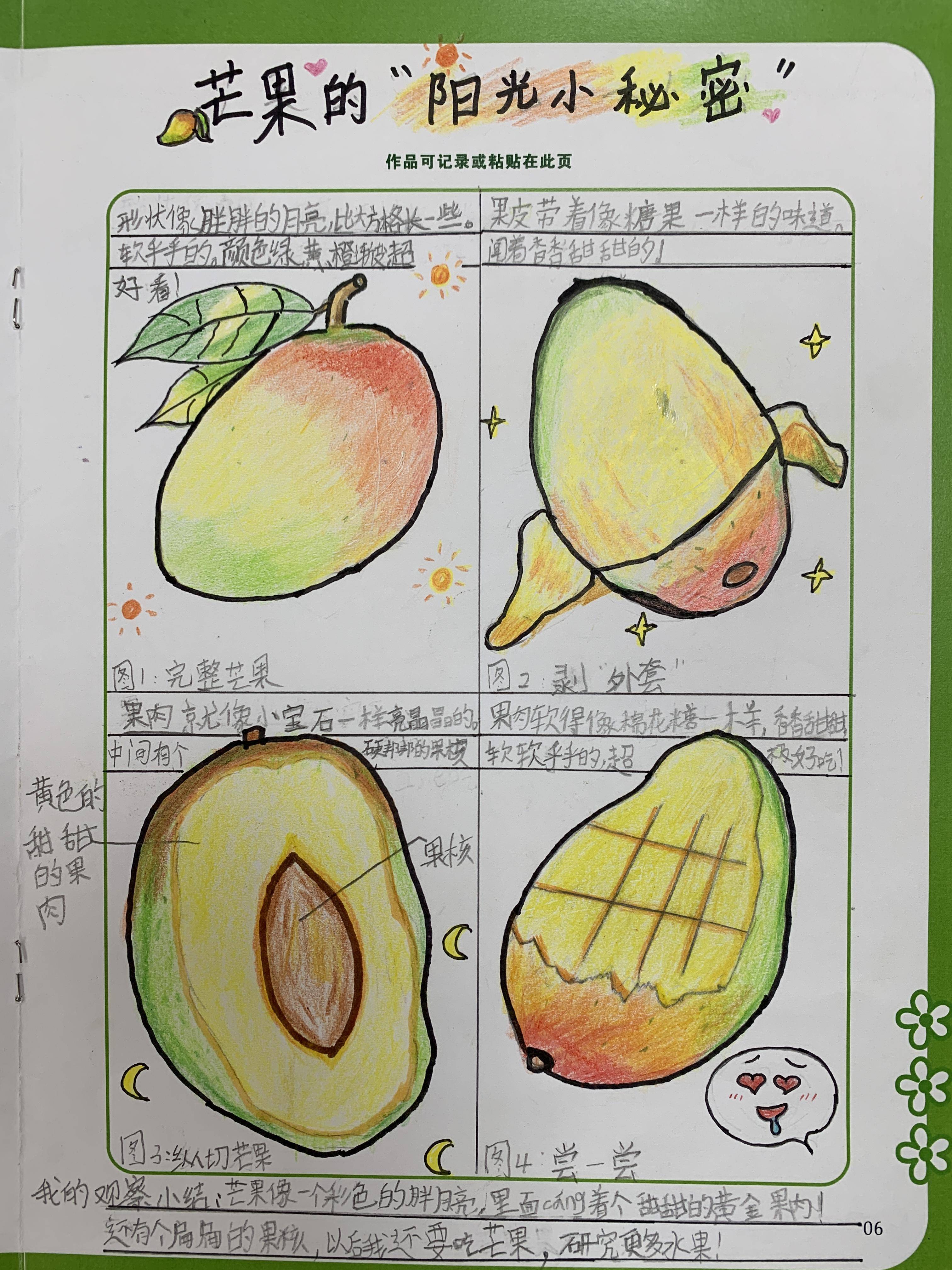 有的孩子轻轻剥开荔枝红褐色的“外衣”,仔细探究果柄、果肉和果核之间的结构,为荔枝搭建起一座清晰的“身体城堡”;有的孩子化身“水果品鉴师”,为糯米糍、妃子笑等不同品种制作“特色名片”;在“芒果探秘”中,“热带水果之王”不再是一个抽象称号,孩子们通过图文并茂的记录和充满趣味的小实验,真正理解了它丰富的营养价值;