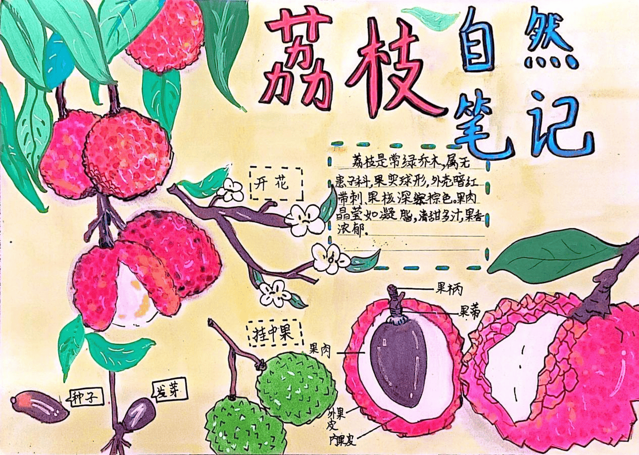 第二项任务是用画笔为荔枝、芒果等水果绘制“解剖图”,形成自然观察笔记。