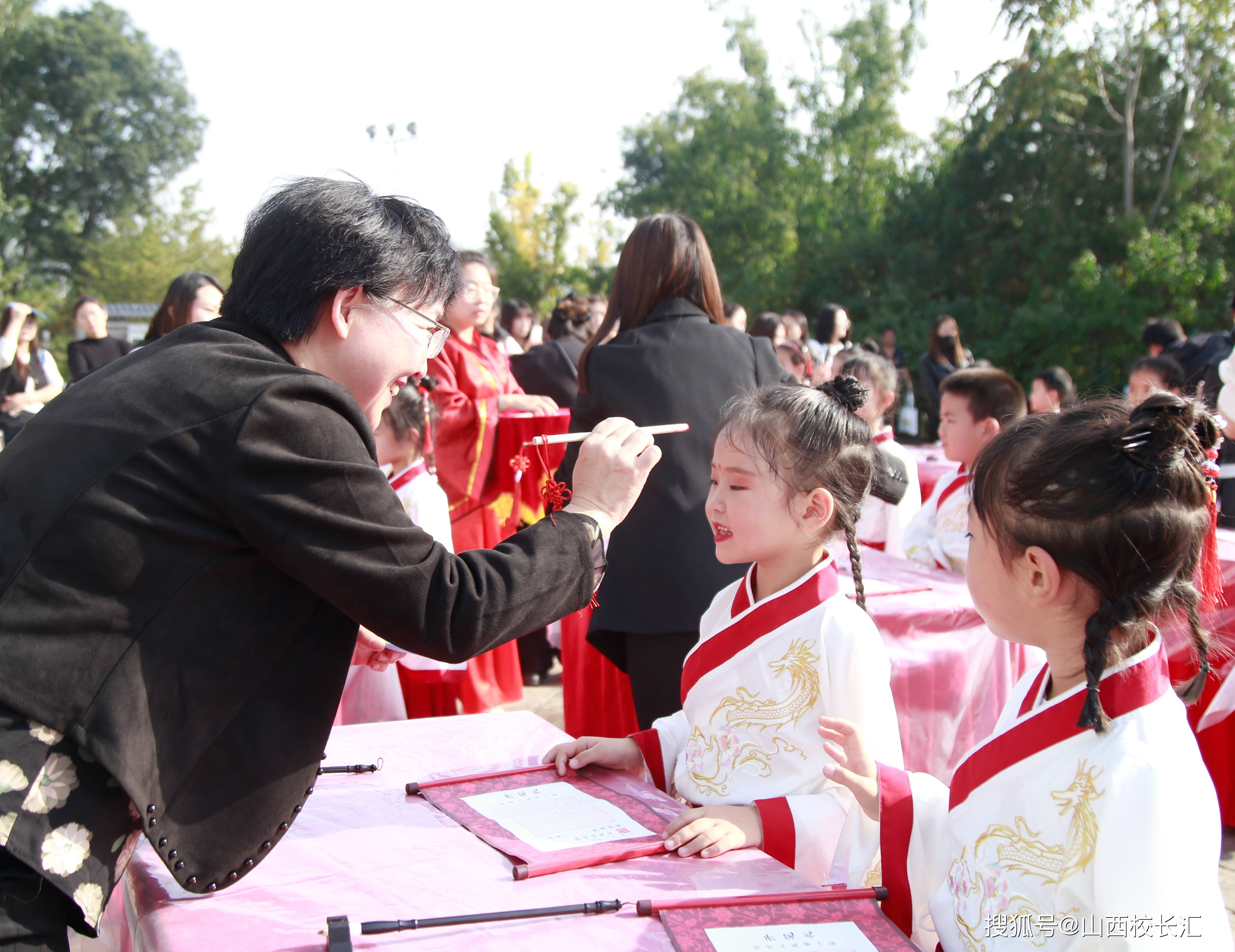 在主礼人魏杰老师的引领下,开笔礼流程有序展开。“正衣冠”时,学子们在教师带领下整理衣领、掸直衣袖,以整洁仪表明“先正衣冠后明事理”之理;“拜孔子”环节,四拜“为天地立心”“为生民立命”等箴言,敬先贤风骨传治学之道;“朱砂启智”中,老师为学子眉心点丹砂,寄愿眼明心亮;“描红开笔”时,一笔一划书写“人”字,领悟“相互支撑”“顶天立地”的做人真谛。此后,学子们齐诵傅山家训“静、淡、远、藏”十二字箴言,击鼓三声明“尊敬师长、热爱学习、报效祖国”之志,最终接过礼成证书,将仪式感化为成长的力量。