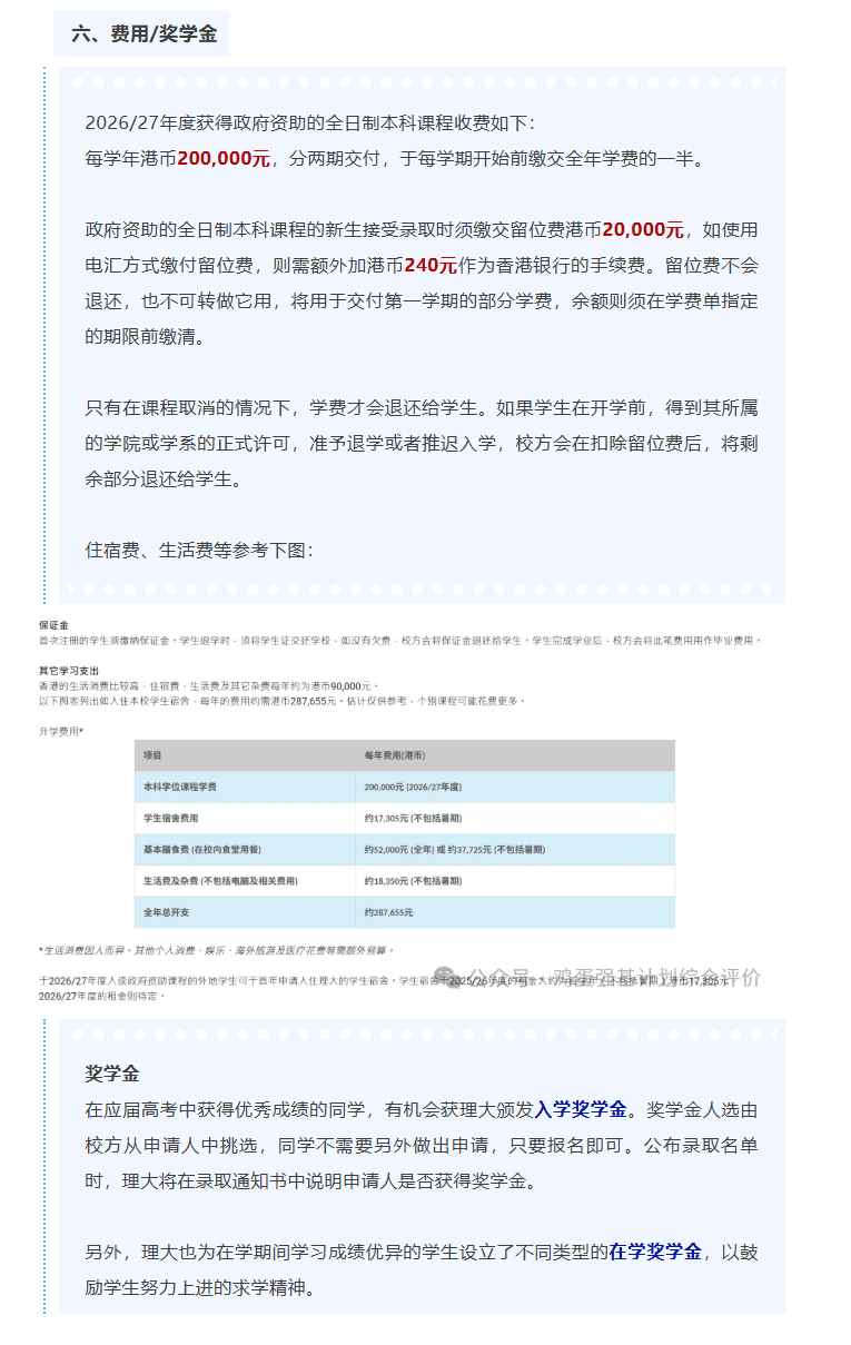 在应届高考中获得优秀成绩的同学,有机会获理大颁发入学奖学金。奖学金人选由校方从申请人中挑选,同学不需要另外做出申请,只要报名即可。公布录取名单时,理大将在录取通知书中说明申请人是否获得奖学金。