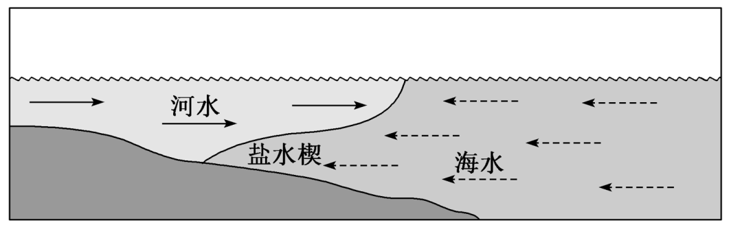 2.解释成因: “由于海水密度大于河水密度,且此处河流作用强于潮汐作用,导致密度大的海水从底部潜入河口,形成楔状结构。”