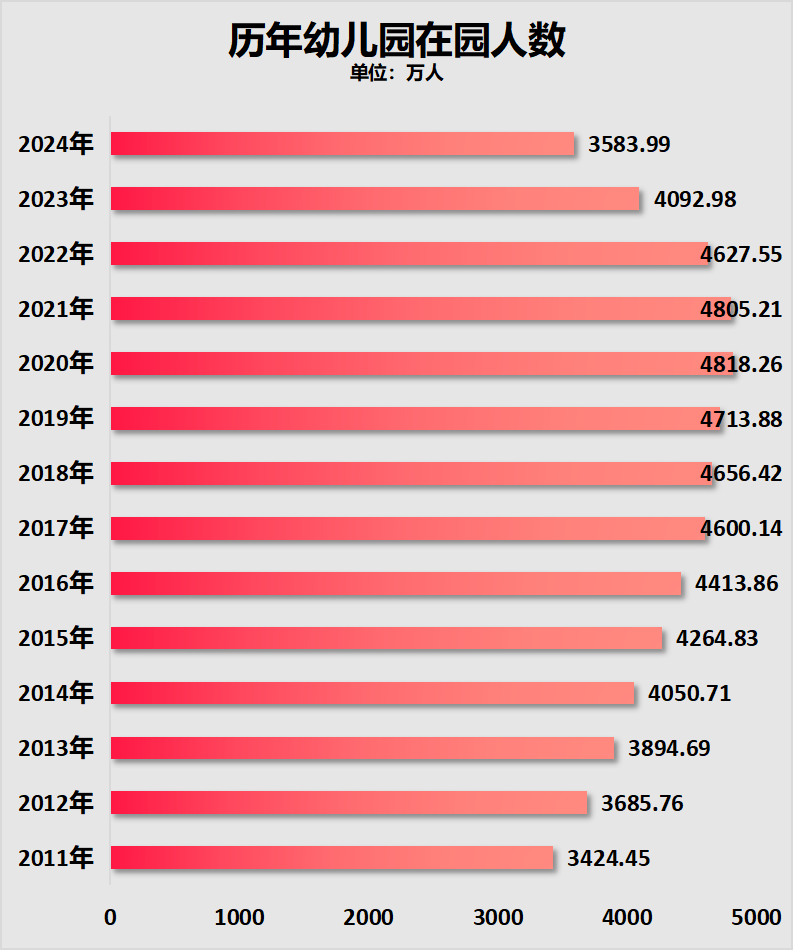 从下面的历年数据可以看到,过往每年增幅人数基本都是200万人左右,而如今减少幅度明显在加快,2023年和2024年幼儿园在园人数每年都减少了超500万人。