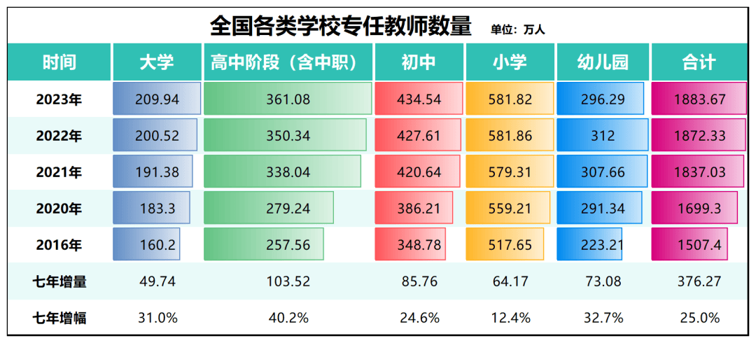 但从上面的表格可以看到,幼儿园和小学专任教师在2023年首次减少了。幼儿园2023年相较于2022年减少了15.71万专任教师,小学减少了0.04万专任教师。