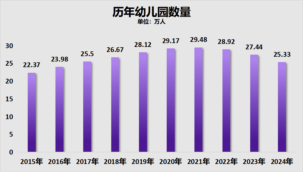 教育部公布的数据显示,自2022年起全国幼儿园数量持续下降。具体来看,2022年共有幼儿园28.92万所,比上年减少5610所。2023年减少了1.48万所。2024年幼儿园数量25.33万所,减少了2.11万所。