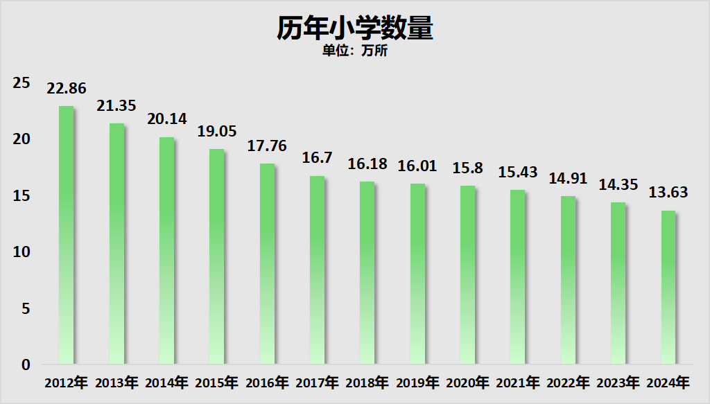 小学方面同样在缩减。教育部数据显示,2024年全国普通小学13.63万所,较前一年减少了0.72万所。