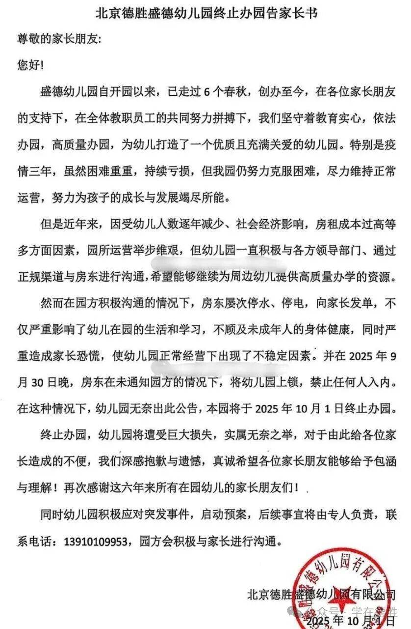 虽然这所幼儿园没过几天表示已恢复入园,但是10月1日,一封终止办园告家长书还是出现在大家面前,宣告彻底关闭。