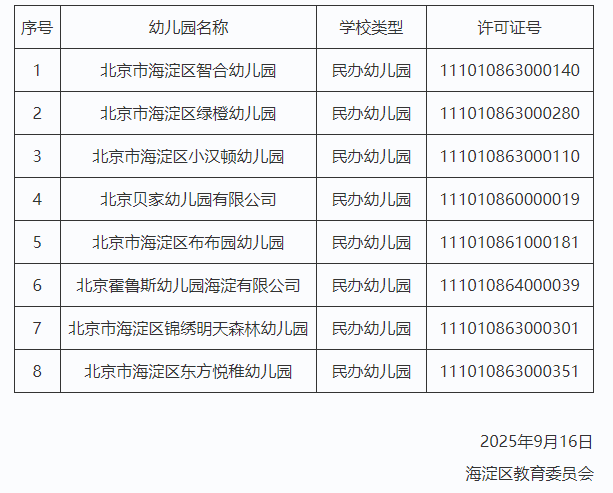 “经调查核实,北京市海淀区智合幼儿园、北京市海淀区绿橙幼儿园、北京市海淀区小汉顿幼儿园、北京贝家幼儿园有限公司、北京市海淀区布布园幼儿园、北京霍鲁斯幼儿园海淀有限公司、北京市海淀区锦绣明天森林幼儿园、北京市海淀区东方悦稚幼儿园8所民办学校无实际招生、办学行为,办学许可证有效期届满未延续。”
