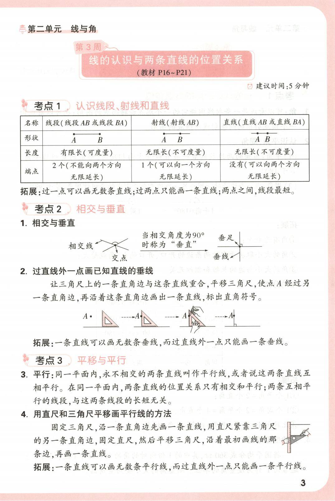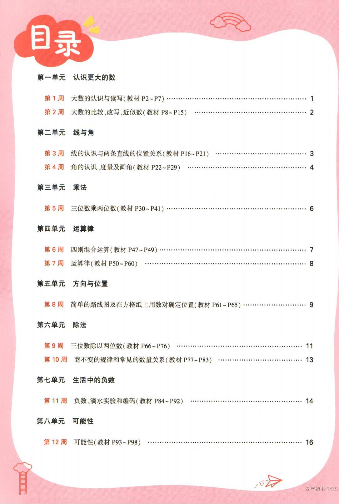 “线与角”,包含线段、射线、直线的认识,以及两条直线的位置关系,像相交、垂直、平行,还有角的认识、度量与画角。“乘法”,主要是三位数乘两位数的知识。第四单元 “运算律”,涉及四则混合运算和运算律。“方向与位置”,有简单路线图的认识和用数对确定位置。“除法”,包括三位数除以两位数、商不变的规律和常见数量关系。“生活中的负数”,介绍负数、滴水实验和编码。 “可能性”,讲解事件发生的可能性。这些内容围绕四年级上册数学知识,能帮助学生梳理、回顾所学知识,让学生在周末复习时,能清晰了解各单元的核心考点,熟悉知识要点,从而更好地巩固数学知识。