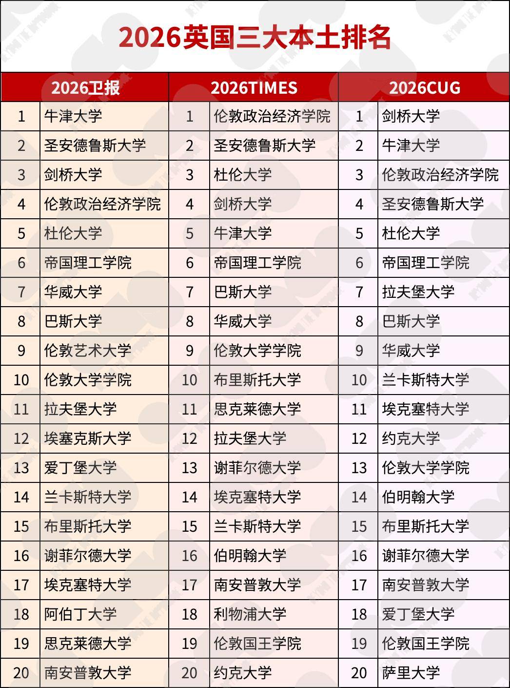 近期,英国三大本土权威大学排名——《卫报》(Guardian)、《泰晤士报》(Times)和《完全大学指南》(CUG)陆续公布。