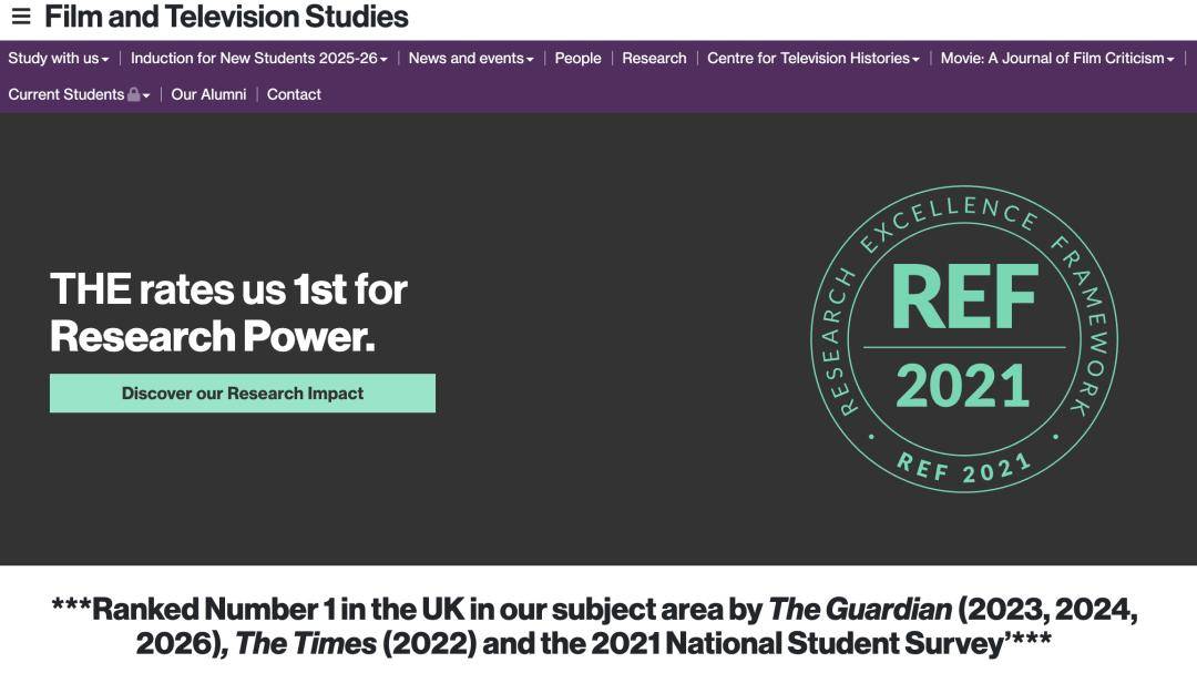 华威大学的电影电视研究在英国的认可度极高,在《卫报》(2023、2024、2026)、《泰晤士报》(2022)和 2021 年全国学生调查中,该领域在英国排名第一!