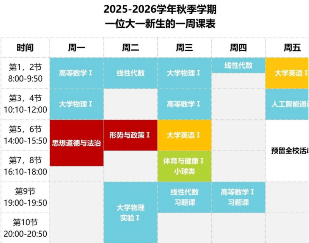 从一位大一新生的一周课表来看,宁波东方理工本学期为首届学生开设了包括高等数学、大学物理、人工智能通识在内的9门通识与基础课程,重在强化学生的数理基础、计算思维和英语能力,为后续的专业学习与交叉创新夯实基础。