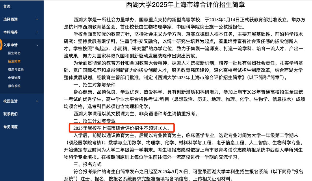 今年,在浙江省“创新班”招生试点的基础上,西湖大学首次面向上海市、江苏省、河南省、广东省、重庆市等5个省(市)招收本科生,其中面向上海市开展综合评价招生。