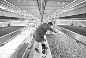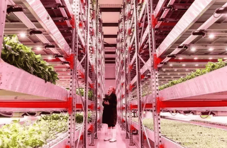 英国某公司把位于伦敦市区12层的地下防空洞改建成了世界上首个地下农场。该农场有特定的通风系统、先进的照明以及成熟的灌溉系统。下图为地下农场局部景观图,据此完成下面小题。
