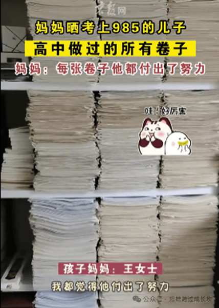 网上一位妈妈分享儿子考上 985 的喜讯时,晒出了一叠叠高考备考卷。