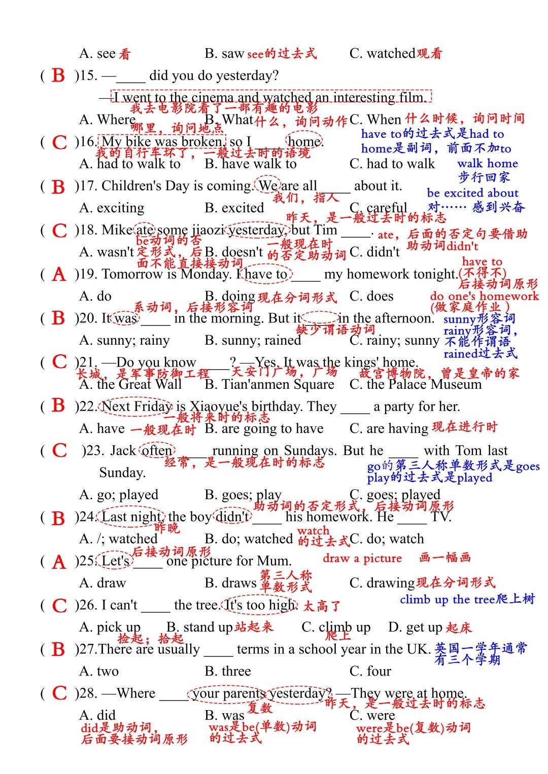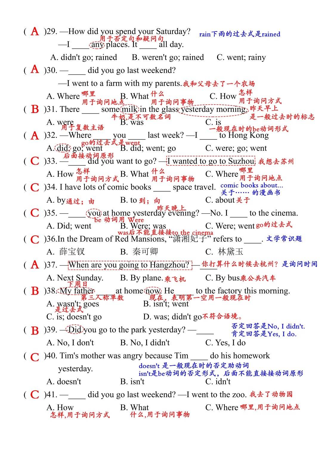 对学习有着很大的帮助意义。首先,它全面且细致地考查了第三单元的核心语法知识,通过多样的题目设置,能让学生充分接触不同的语言场景,加深对一般过去时、名词、介词、特殊疑问句等语法点的理解与掌握。其次,每道题的批注起到了很好的讲解作用,学生在做题过程中,能借助批注清晰了解考点所在、语法规则的运用以及解题的关键步骤,有助于学生自主学习,及时解决疑惑,强化对知识的记忆与运用能力。无论是日常的语法学习巩固,还是为考试做准备,这份资料都能帮助学生更好地梳理知识,提升英语语法水平与解题能力。
