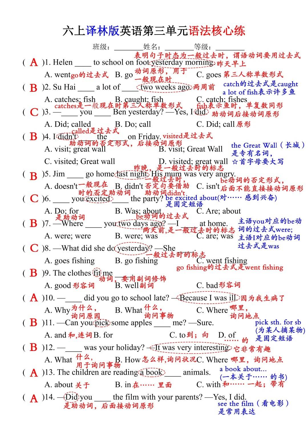 这份六年级上册译林版英语第三单元语法核心练资料,涵盖了丰富的语法知识与题型。从内容上看,涉及一般过去时的动词形式变化,如 “go” 的过去式 “went”、“see” 的过去式 “saw” 等;还有名词单复数,像 “fish” 表示 “鱼” 时单复数同形;以及介词、副词的用法,如 “about”“well”;同时包含了各类特殊疑问句的引导词运用,如 “Why”“Where”“What”“How” 等,此外还有 be 动词的过去式 “was”“were” 的使用,以及一些固定短语搭配,如 “be excited about”“pick sth. for sb” 等。题型为选择题,每道题都针对不同的语法点或知识点进行考查,并且有详细的批注,解释考点、语法规则以及解题思路。