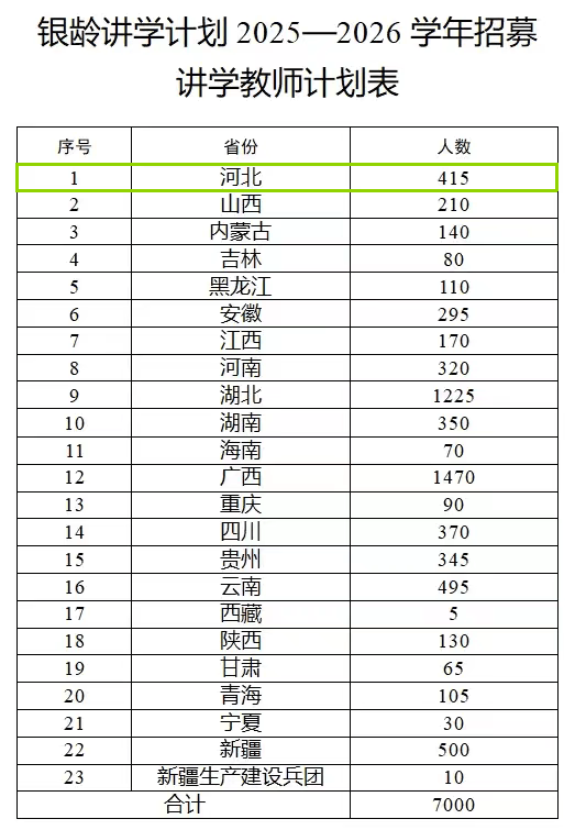 近日,教育部、财政部发布关于做好2025年银龄讲学计划有关实施工作的通知,计划在2025年义务教育阶段招募7000名讲学教师,旨在充分利用退休教师专业优势、经验优势,加强新时代乡村教师队伍建设,推动巩固脱贫攻坚成果同乡村振兴有效衔接。其中,河北将招募415名。