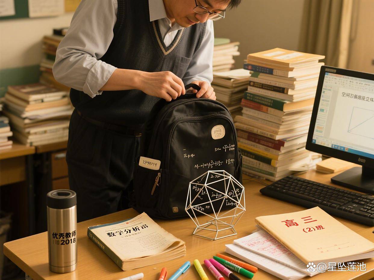 他沉默地开始收拾东西。动作不疾不徐,带着一种近乎刻板的秩序感。把散落的试卷理齐,用夹子夹好;将几本常用的参考书码放整齐;把那支陪伴他批阅过无数作业的红笔,仔细地放进笔袋里。属于学校的物品,他一件没动。只带走纯粹属于他自己的东西:几本私人笔记,那个保温杯,还有那张照片。