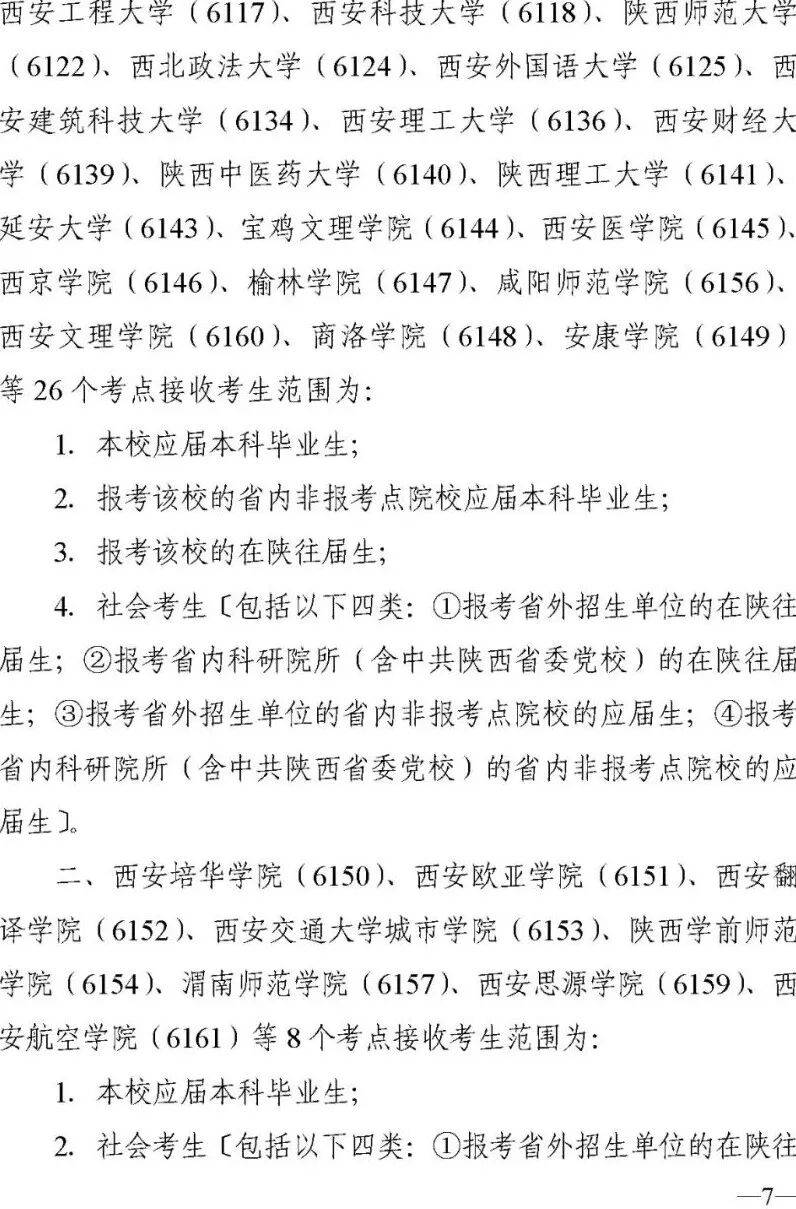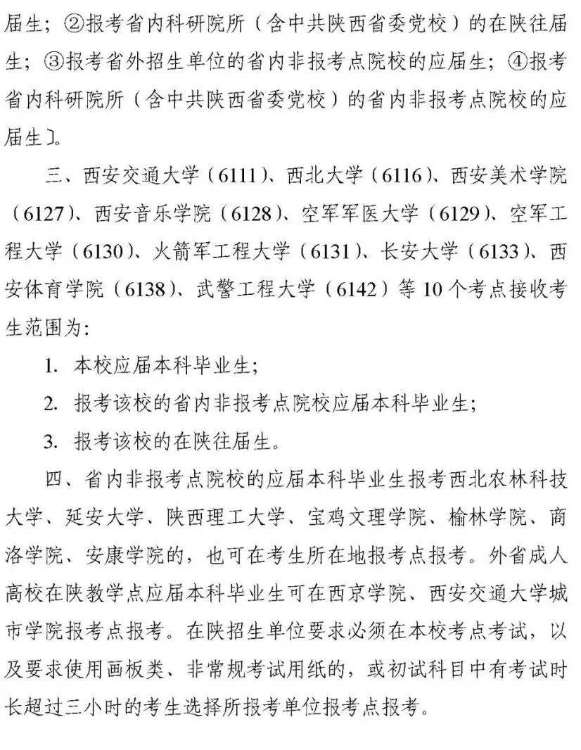 3.我省报考点接受以下几类考生报名:一是在陕就读的应届本科毕业生;二是“户籍在陕”或“工作所在地在陕”的往届生;三是报考在陕招生单位的单独考试考生;四是在陕招生单位要求必须在本校考点考试,以及要求使用画板类、非常规考试用纸的,或初试科目中有考试时长超过三小时的考生。