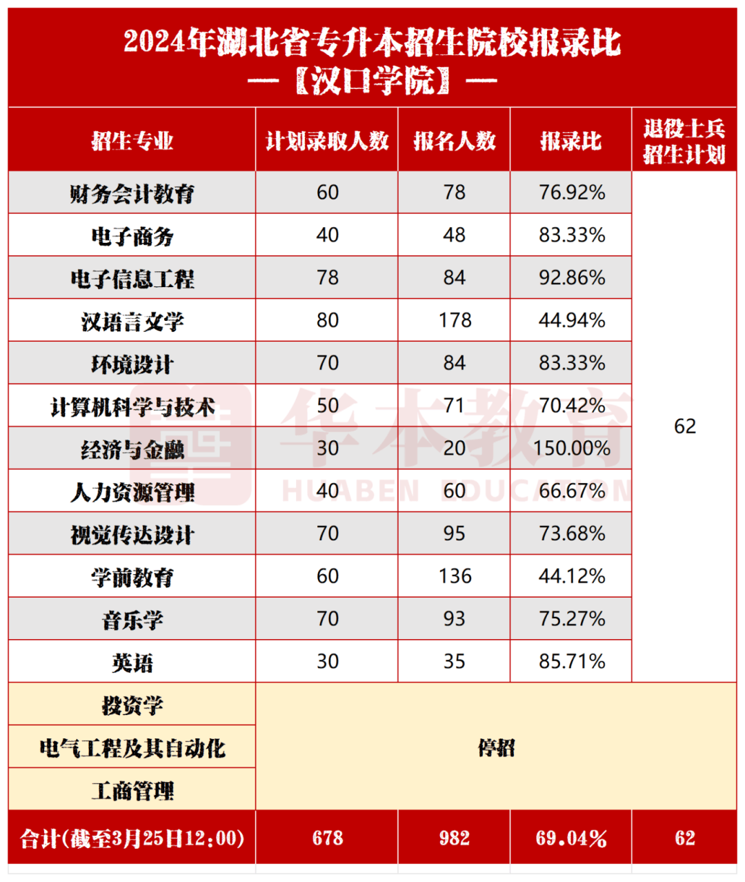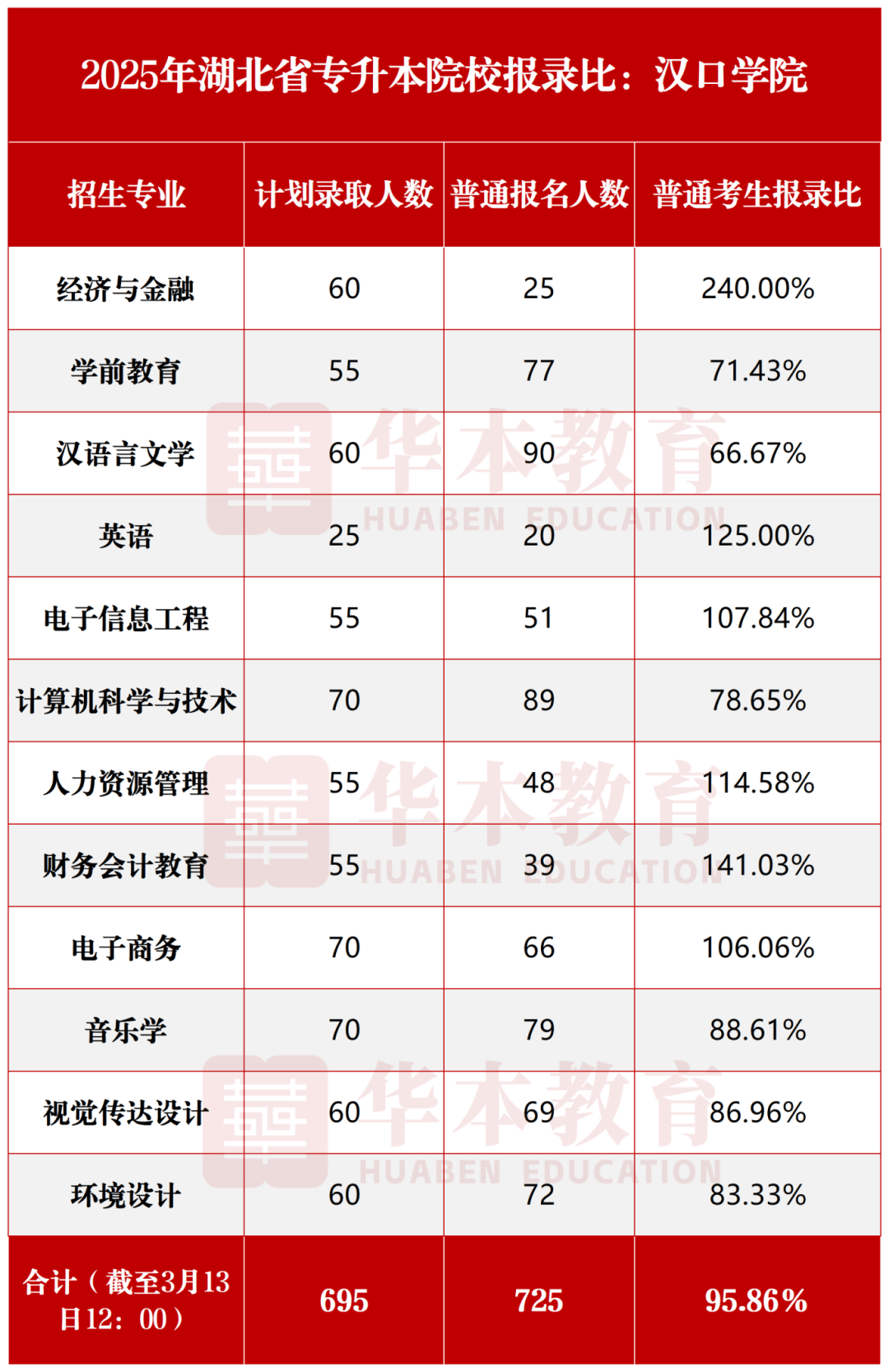 汉口学院2025年共有12个专业招收专升本学生。相比2024年没有变化