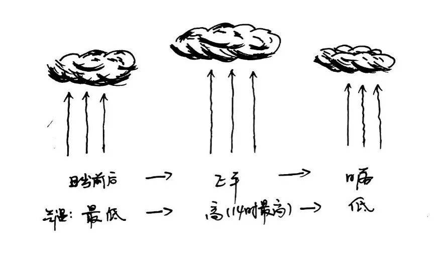 图解:日出前后气温最低,水汽上升降温凝结的高度最低,积云高度最低。