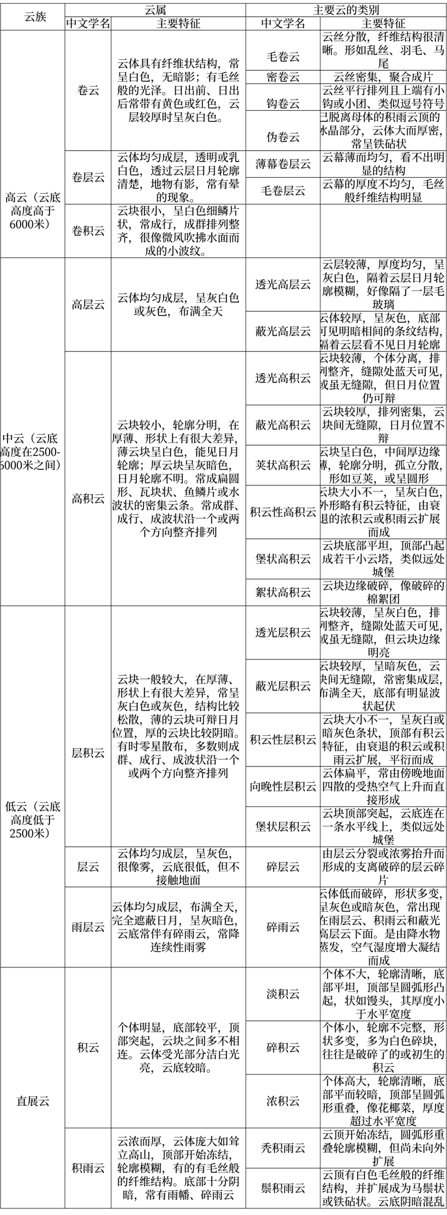 比较笼统地说,云主要有三种形态:一大团的积云一大片的层云纤维状的卷云。具体来说主要以下十种(表格中文字摘自《气象知识》):