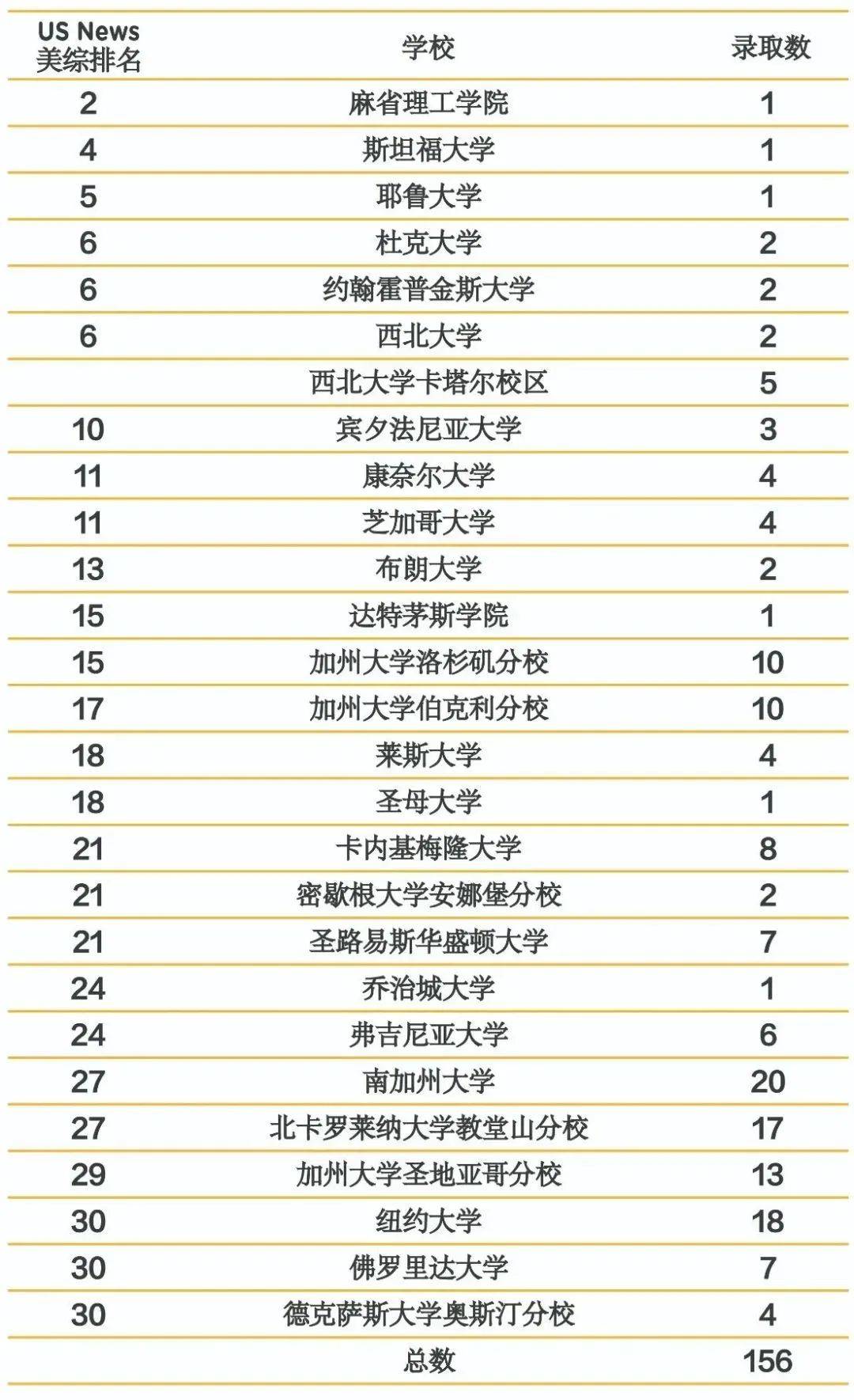 截至2025年4月10日前,星校申请美国综合大学的132位学生中有78位收获来自US News美国综合大学排名前三十大学的156份录取。