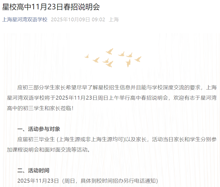 在星河湾此次官宣的招生信息中,活动主要面向应届初三毕业生,对生源没有强制要求,上海生源或非上海生源均可。