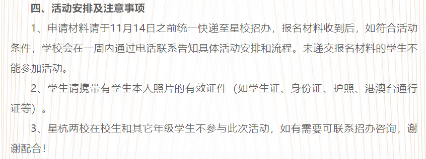 划重点,学生的申请材料需要在11月14日前统一快递到星河湾招生办。如果符合要求,星河湾会一周内通过电话联系,告知具体活动安排和流程,没有递交材料的学生不能参加活动。