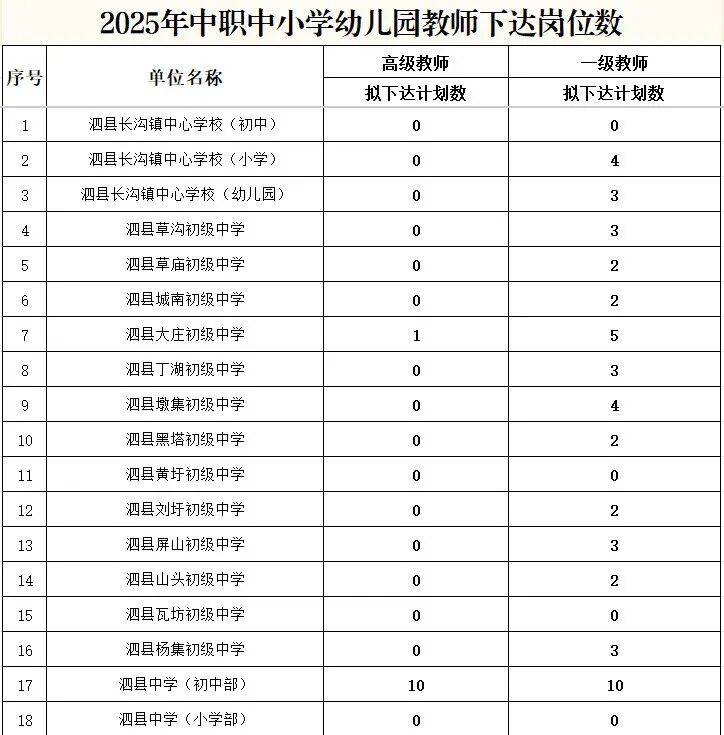 根据宿州市人力资源和社会保障局《关于做好2025年度全市职称评审工作的通知》(宿职评〔2025〕1号)和宿州市教体局 宿州市人力资源和社会保障局《关于做好2025年度全市教育系列专业技术资格评审工作的通知》(宿教体人〔2025〕47号)文件规定,现将2025年全县中职、中小学、幼儿园教师拟下达岗位予以公示。