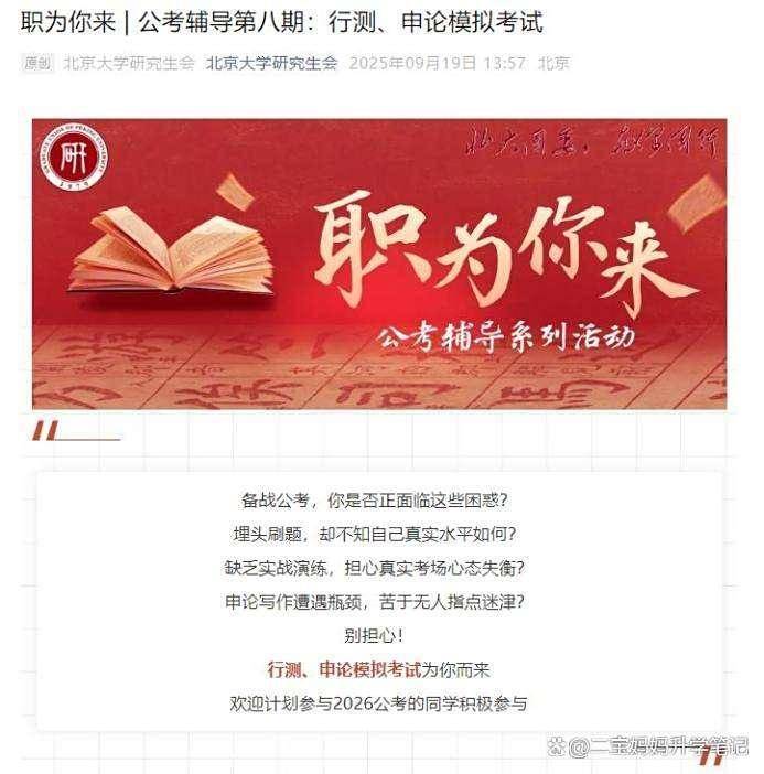 北京大学已将其打造成系统化的“公考辅导系列”就业品牌活动。仅2024年9月至11月,北大就开展了6次线下行测及申论模拟考试,系列活动累计吸引来自全校各专业800余人参与。