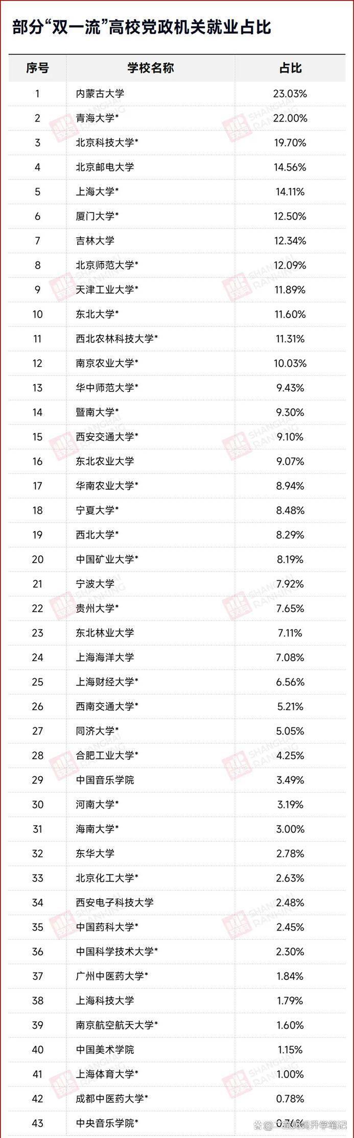 内蒙古大学有23.03%的毕业生在机关就业,北京科技大学、青海大学的党政机关就业比例分别为22.19%、22.00%。北京师范大学、东北大学、西北农林科技大学、南京农业大学2023年也有超过10%的毕业生就业于党政机关。