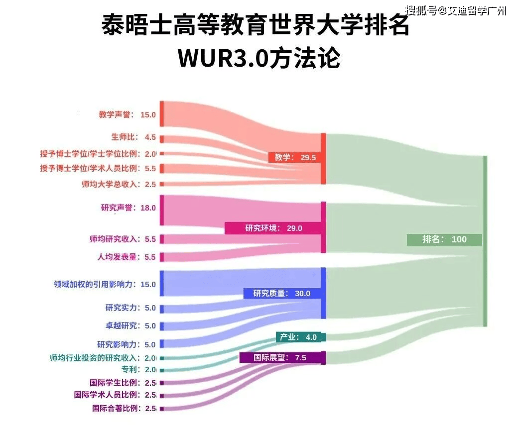 该排名指标分为5个方面,包括:教学、研究环境、研究质量、产业和国际展望。具体内容和占比情况如下: