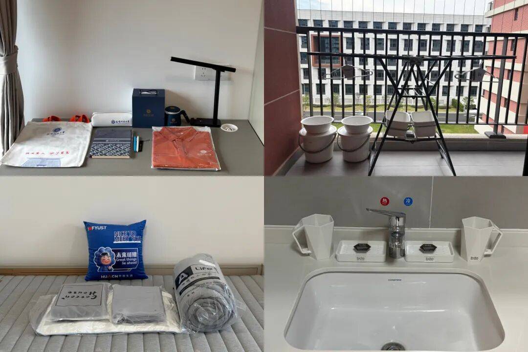 学校为每位新生准备了入学欢迎礼包,包括:福耀科技大学定制T恤衫+定制多功能帆布袋+便携笔袋+创意马克杯+多功能护眼台灯+床上用品(床单/被套/枕套三件套、床垫 、6斤新疆棉冬被、夏季毛巾被、蓬松枕芯)+洗漱套装(漱口杯、手提篮、脸盆、肥皂盒、水桶、毛巾礼盒)+晾晒用品(每宿舍共享折叠晾衣架1个+ 每人个人衣架10个)。