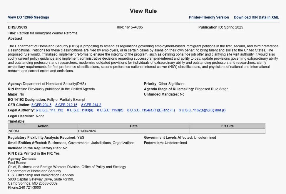 过去48小时,“明年起NIW、EB-1将收紧”在移民圈热传。经查证,确实有相关线索出现在白宫统一规章议程(Unified Agenda)中,条目为“雇佣类移民申请改革”(RIN 1615-AC85)。文件显示,美国移民局(USCIS)计划于2026年1月公布该改革的拟议规则(NPRM),主要针对EB类职业移民申请程序与资格标准的调整。